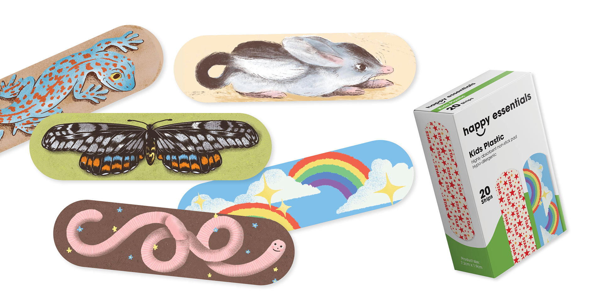 A range of illustrated first aid strips for Good Price Pharmacy’s in store brand “Happy Essentials”. A small sample of some of my illustrated designs for the project are shown below. I also created a range of typography based illustrations for the project featuring fun words for children, such as “Awesome” and “Great” etc.