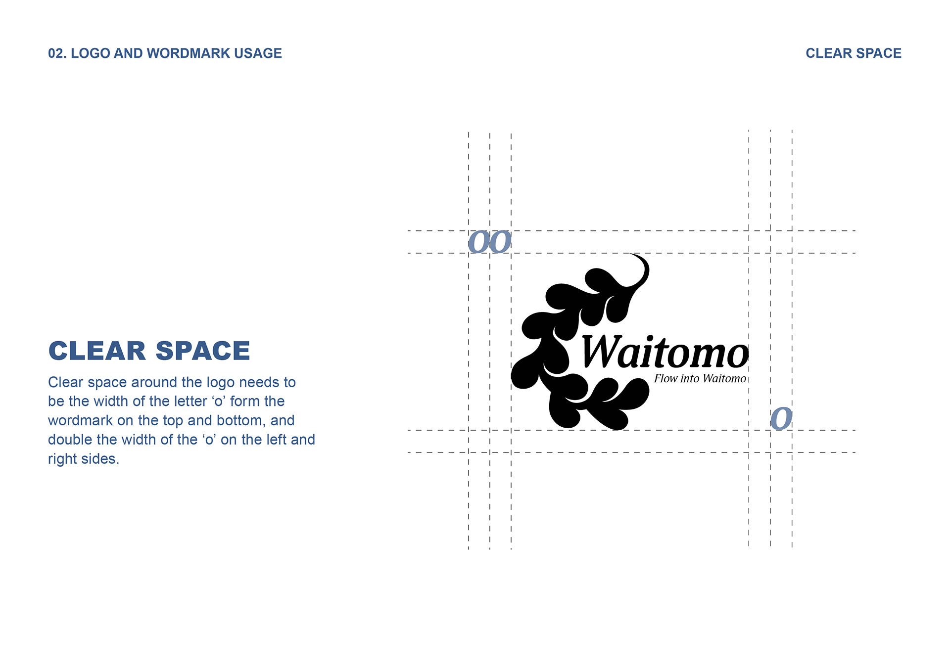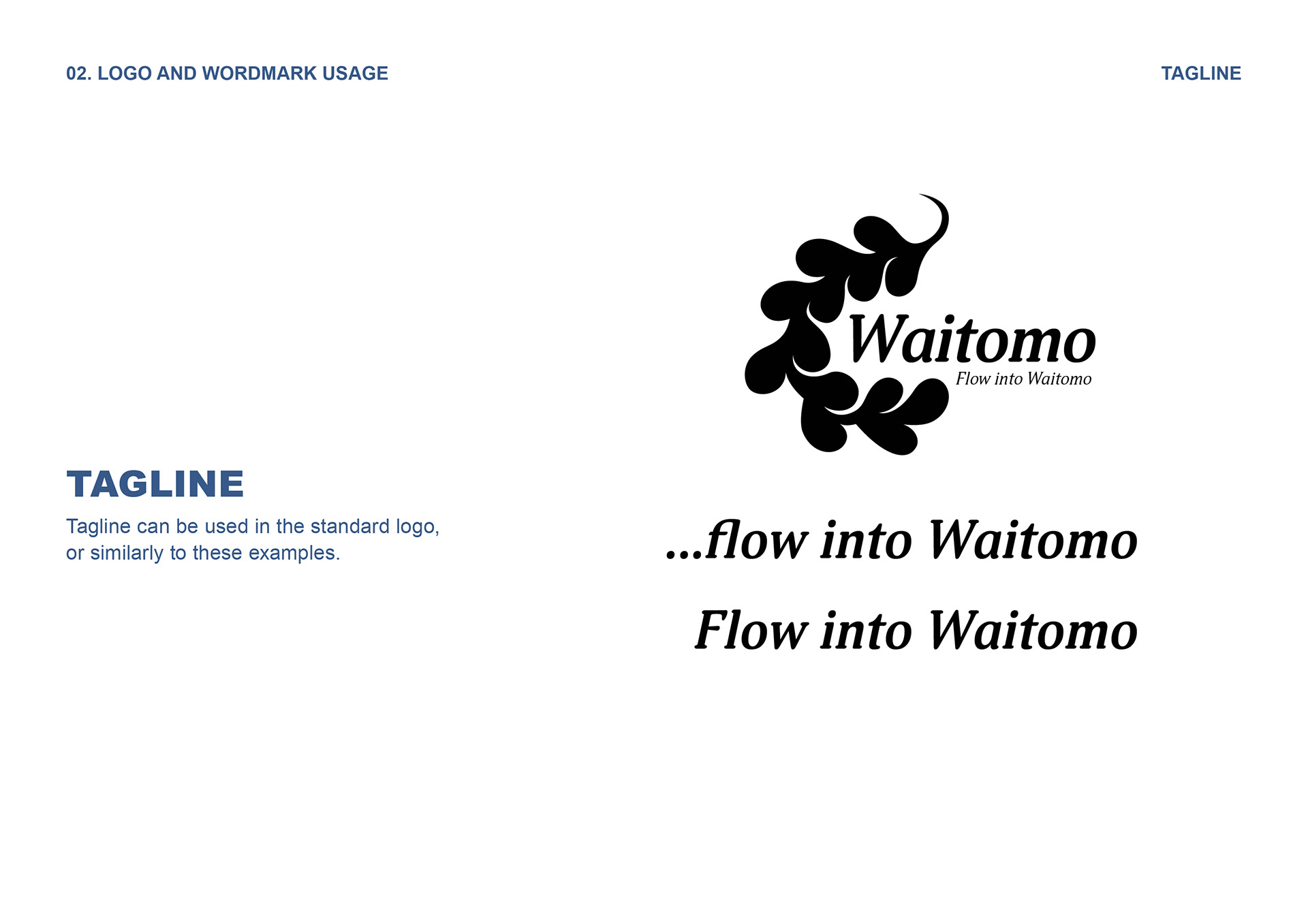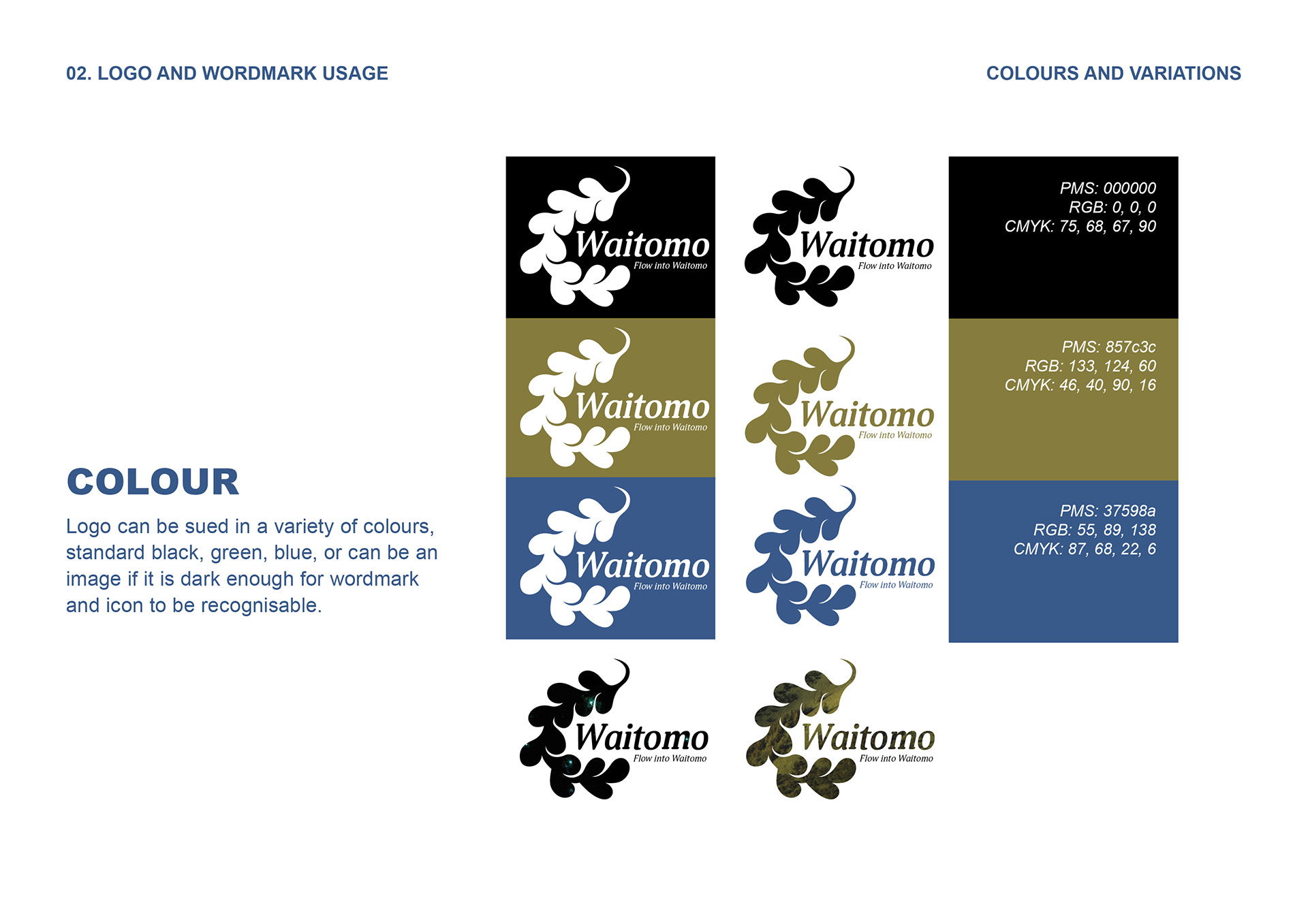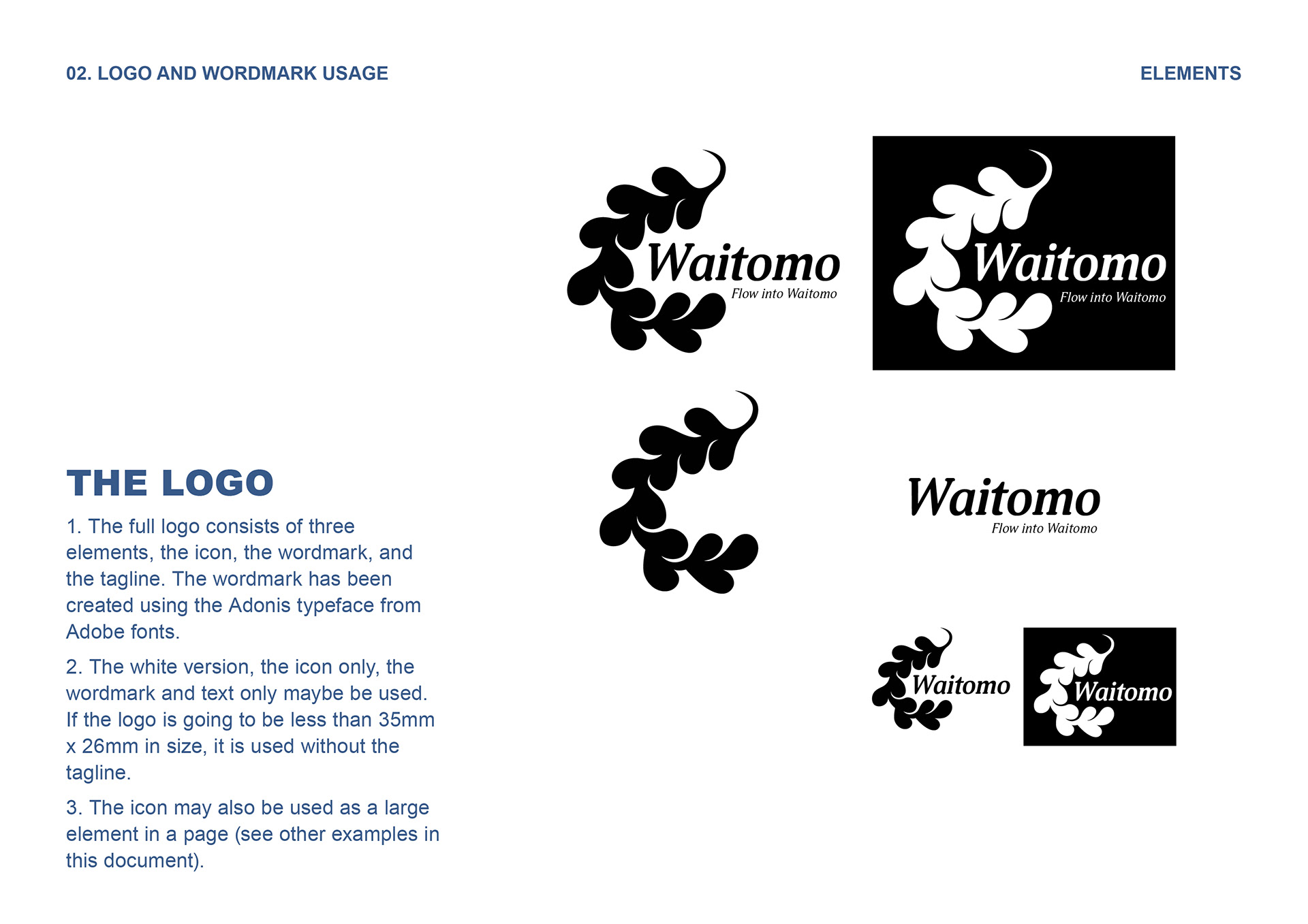 Branding guidelines and logo design for Waitomo, a district in New Zealand.
