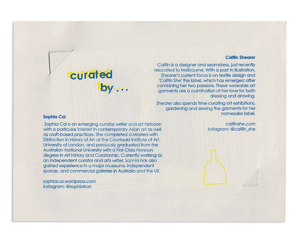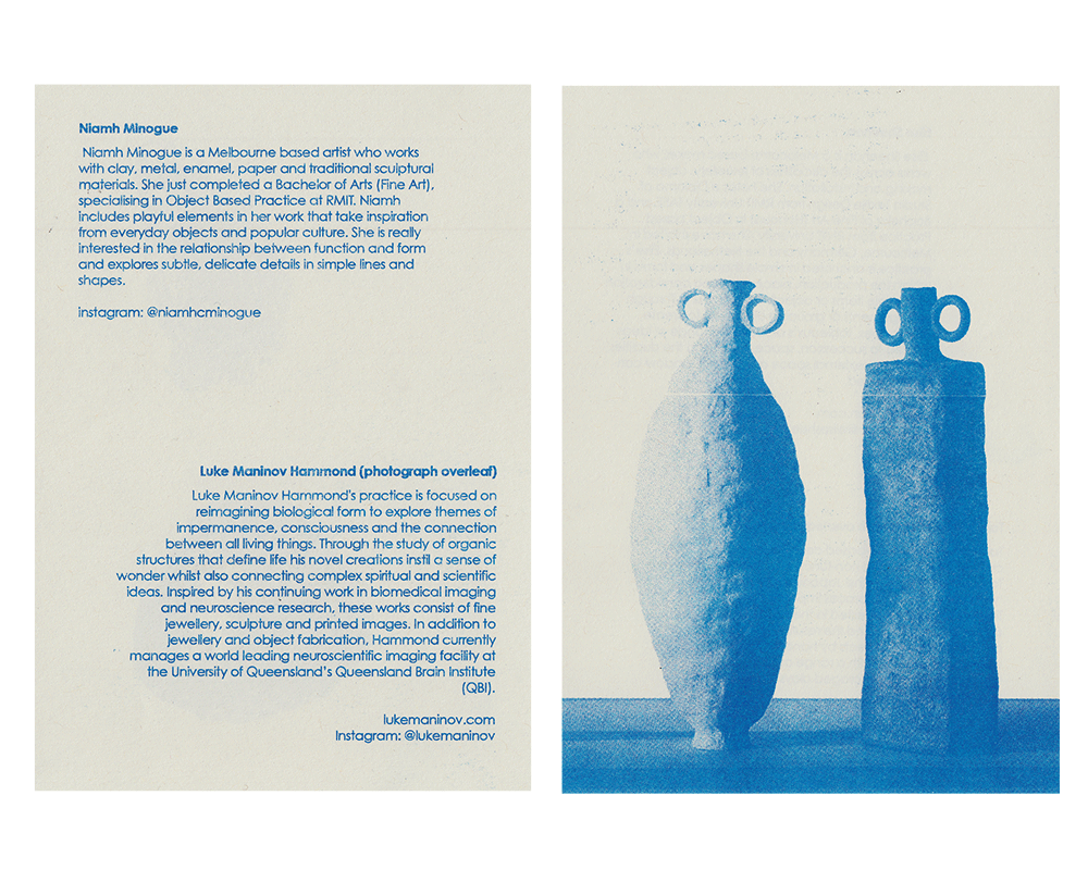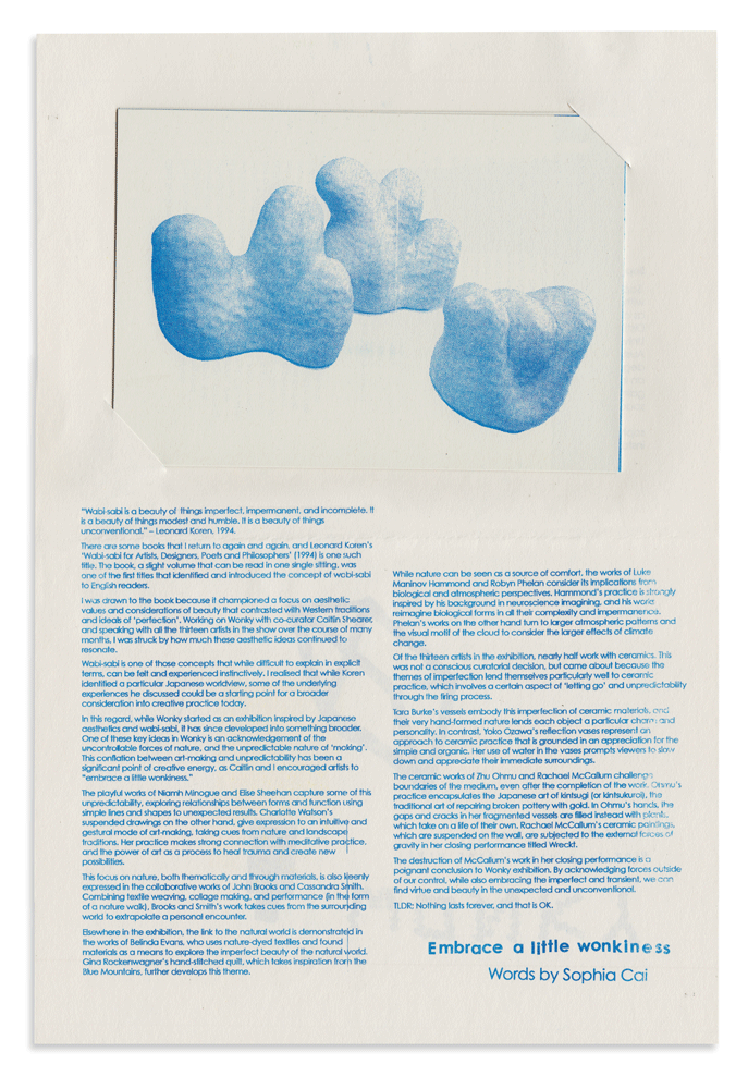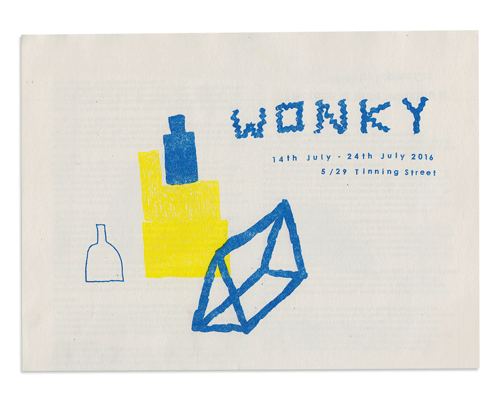 Design and risograph printing of catalogue for 'Wonky' group art show at Tinning St gallery in Melbourne. Catalogue folds out for exhibition essay, and featured prints inside of selected work with all artists bios.